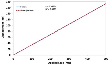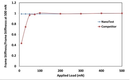 Constant frame stiffness is critical for ensuring accurate elastic modulus measurements across the entire load range. A simple direct frame stiffness calibration method developed by MML has been used to prove that the frame stiffness of the NanoTest does not vary across the entire load range of each loading head.  The correlation coefficient is 0.9999 over the full load range.