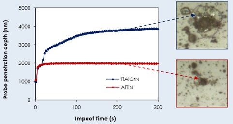 The above figure shows the improved crack resistance of AlTiN, consistent with its longer lifetime in cutting tool tests on aerospace alloys. The results correlate with field trials of coating performance but the nano-impact tests are much quicker so the pace of coating development can be increased dramatically [GS Fox-Rabinovich et al, Surf Coat Technol 204 (2009)489]